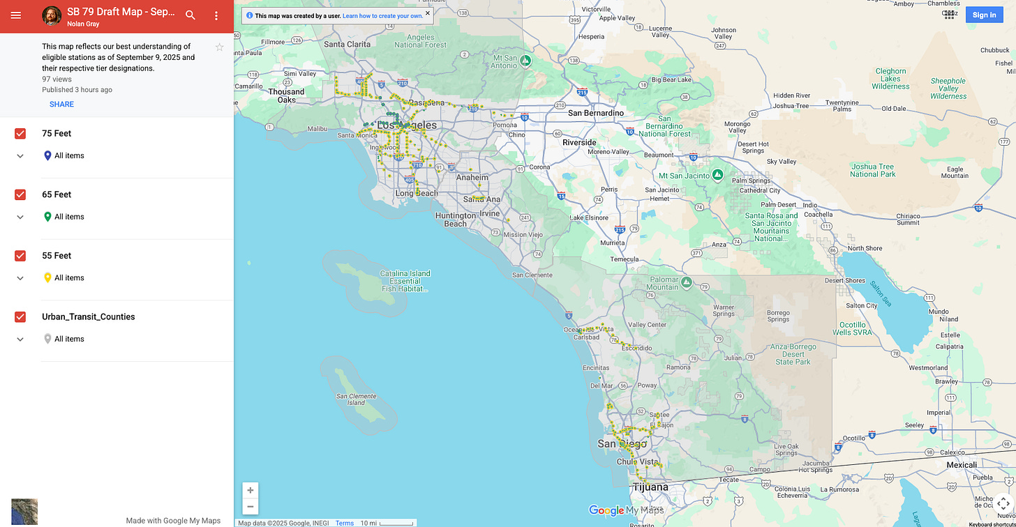 This map does not reflect anyone’s belief as to where SB 79 except our own—among the co-sponsors, we had spirited debates as to what is and is not covered.